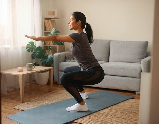 (Indian woman performing bodyweight squats in a small apartment living room)