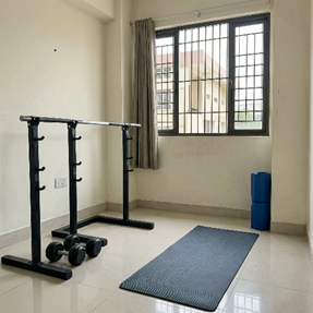 (Minimal home gym setup in an apartment with dumbbells and a yoga mat)